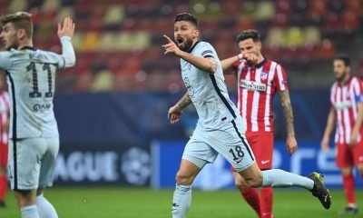 Olivier Giroud of Chelsea reacts as the flag goes up for offside. After a VAR deliberation the offside decision is overturned and Olivier Giroud scores their...