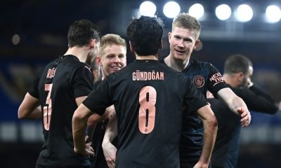 Ilkay Guendogan of Manchester City celebrates with team mate Kevin De Bruyne after scoring their side’s first goal during The Emirates FA Cup Quarter Final match...