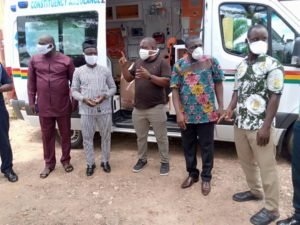 The Member of Parliament for Jomoro constituency in the western Region Hon. Paul Essien who also double as the Deputy Minister for religious and chieftaincy affairs together with Hon. Ernest Kwofie (MCE for Jomoro) and Jomoro NPP constituency Chairman Mr. Simon Amoah together with other party executives today donated a brand new ambulance to Elubo health center. The MP donated a brand new Ambulance fitted with accessories to the Elubo health centre.