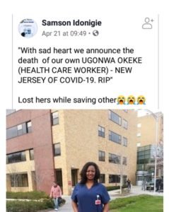 “With sad heart we announce the death of our own Ugonwa Okeke (Heath Care Worker) New Jersey of Covid-19,” he wrote.