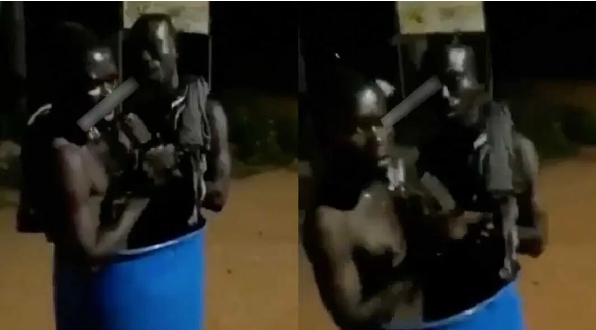 Some news outlets in Ghana reported that the two thieves were caught stealing in Oti Region of the country and were forced into a barrel, before being asked to sing praises to God.