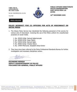 A press release issued by the Public Affairs Directorate at the Police Headquarters in Accra on December 16, 2025, said the interdictions followed findings of multiple breaches linked to how the officers displayed and used police attire online.