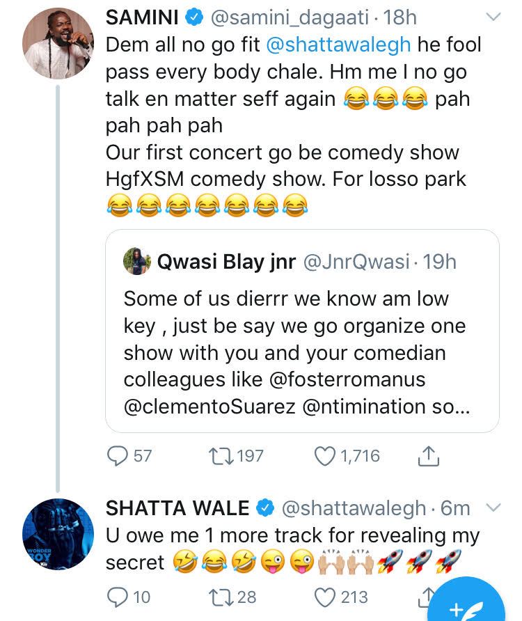 This happened after Samini replied a tweet from a fan who said he was going to organize a comedy show for him and some other comedians.