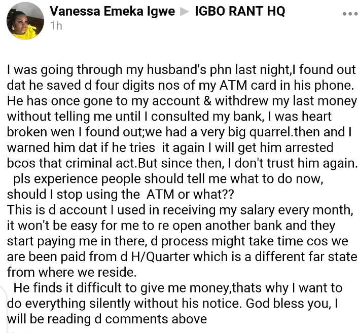 According to the woman, She was checking her husband’s telephone and she found that he had saved the 4 digits pin of her ATM card on his phone.