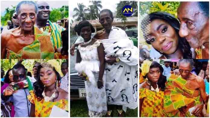 The photos and video show an aged-looking groom and his very young bride at their traditional wedding, dressed in beautiful kente attire and dancing.