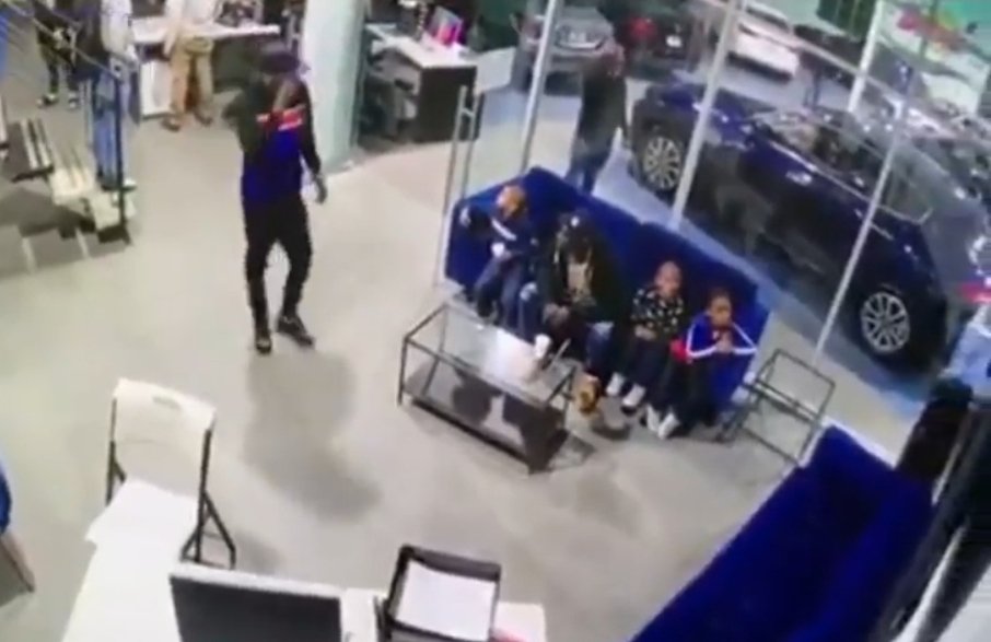 One of the suspects carjacked a green four-door sedan immediately after the shooting. The driver, 49, of the car was reportedly ordered at gunpoint from his vehicle while stopped at a red light near the dealership.